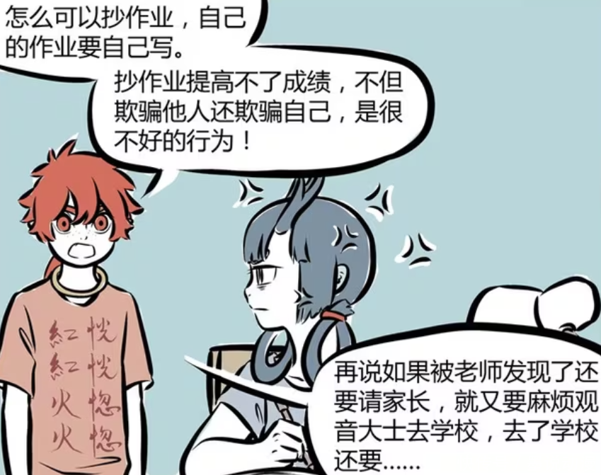 红孩儿怎么可能让龙女抄作业,他表示作业要自己写。抄作业提高不了成绩,不但欺骗他人,还欺骗自己,这是很不好的行为。龙女本身就不太爱学习,每次考试都是及格边缘。红孩儿没看到龙女很生气,还在一旁不断的说教,所以接下来就得遭殃。
