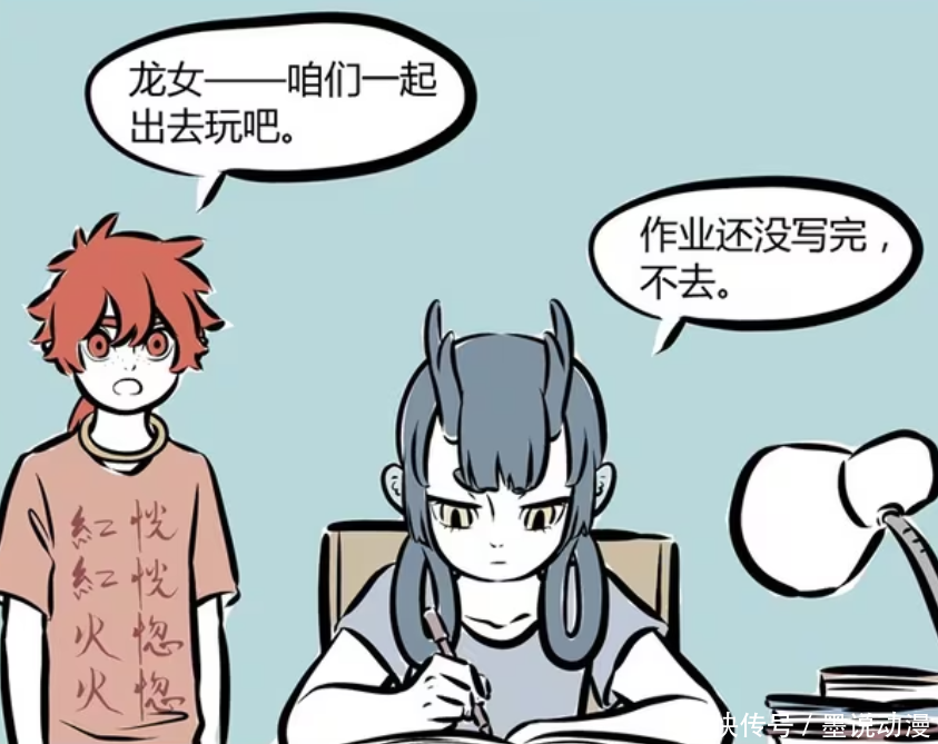 《非人哉》漫画版中,龙女和哪吒一样,对学习提不起劲。暑假作业也是堆积到最后一天才拼命写。原本龙女想抄红孩儿,但是被拒绝,还被说教,最终红孩儿被揍了一顿。为了解决暑假作业问题,龙女打电话给哮天,让他帮忙吃掉作业,这样就不用继续写。